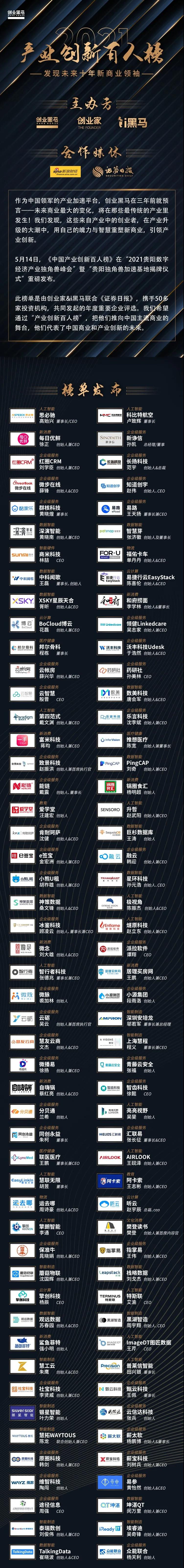 本次評選前后歷時4個月,自1月啟動報名以來,僅兩周就有近300多家企業報名,通過線上評審會,投資人、行業專家、媒體第三方等組成的評審團對參選企業進行打分,層層篩選,最終100家企業創始人上榜。(詳細榜單見文末)