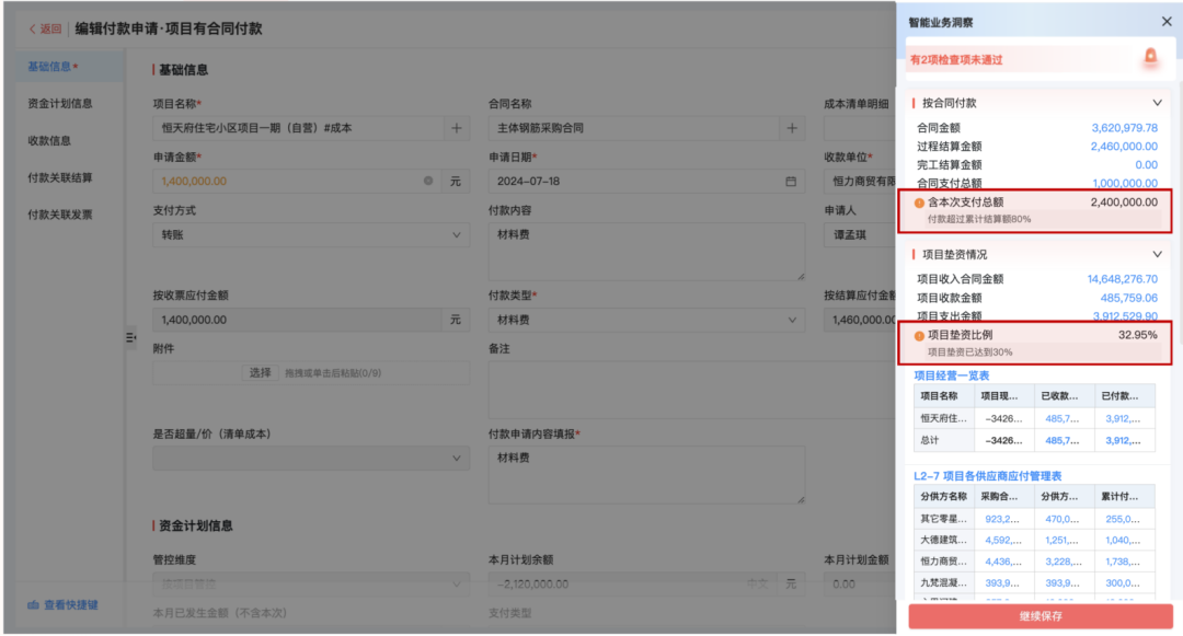 通過系統(tǒng)實時看得到公司資金情況,明確知道哪些項目能有資金去做去投資、哪些資金要計劃對外結(jié)算支付,項目現(xiàn)在開了多少票、還有多少錢沒有回,同時也能對進度款、質(zhì)保金、投標(biāo)保證金等回款設(shè)置提醒,防止逾期未回。項目墊資情況也能同步關(guān)注,判斷公司的經(jīng)營狀況是否穩(wěn)健。