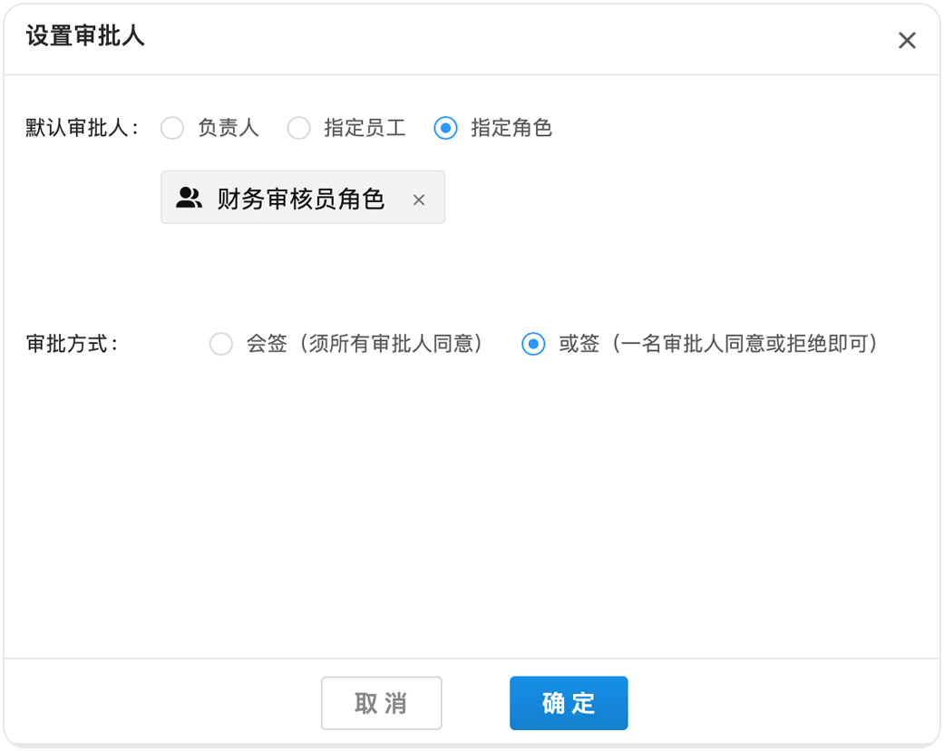 小王公司財務部有兩個同事可以進行報銷審核,在這里可以將他們設置成“財務審核員”角色,然后在流程第二個環節使用“角色”類型審批人節點,這樣他們就都可以收到審批流程了。當財務審核員換人了,企業只需更換角色列表,無需調整審批流程的配置。