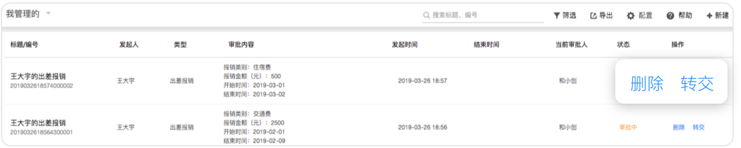 小王平時不僅會提交“出差報銷”這種辦公類審批,還會提交“合同審核”這種經營類審批。公司希望每類審批都由專人來管理模板與數據,防止敏感數據內部泄露。這時公司可以為每個審批設置“模板管理員”,由該審批生成的全部數據將只能由這個模板管理員維護并導出。同時他也可以將審批中的流程轉交給其他人,以避免出現審批人休假或離職后流程卡住的情況。模板管理員還可以協助企業管理員來編輯審批模板,有效分擔工作。