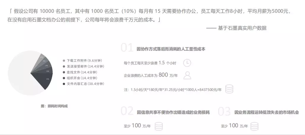 集腋成裘,員工每天花費在傳輸文件、查找文件、內容匯總、文件傳輸上的時間并不是個小數目。對于一家10000 人規模的企業來說,每天至少要耗費 90 分鐘的無效時間,這直接導致企業每年需要付出將近 800 萬元的無效成本。