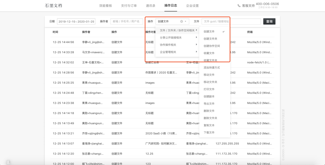 企業高級版中的「操作日志」可以幫助企業實時查詢文件的操作動態。
