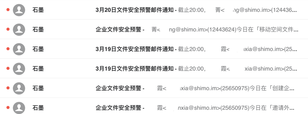 石墨文檔提供的「文件安全預警」功能,可以幫助企業實時監控文件異常狀態,短時間員工大量復制、導出企業文件等異常操作,企業會自動收到郵件通知,降低損失。