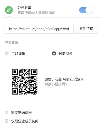 設置文檔公開分享時,可在石墨中設置“需要密碼訪問”或“僅限企業成員訪問”,從而實現文檔的定點定向傳輸,并可有效杜絕內部文檔外泄。