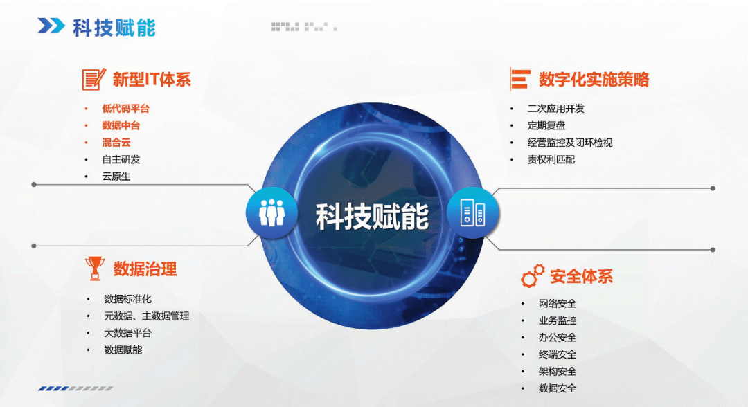 要實(shí)現(xiàn)科技賦能,首先要考慮科技賦能的基礎(chǔ)設(shè)施,這有四個(gè)方面:一是新型IT體系、二是數(shù)據(jù)治理、三是安全體系、四是數(shù)字化實(shí)施策略(圖11)。