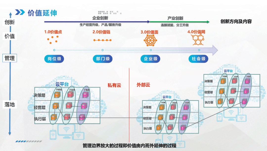 從管理到落地,可以將企業(yè)內(nèi)部的各類系統(tǒng)經(jīng)過抽象后統(tǒng)稱為該企業(yè)的“一朵云”(平臺(tái)),這個(gè)“云平臺(tái)”的組成包括:系統(tǒng)(系統(tǒng)之下可以有子系統(tǒng))、管理模塊、工作單元、工作場(chǎng)景、管理節(jié)點(diǎn)和管理信息因子。從圖中可以看出系統(tǒng)內(nèi)部的模塊間、系統(tǒng)之間的模塊間都是有關(guān)聯(lián)的。企業(yè)的“云平臺(tái)”部署在私有云,而生態(tài)伙伴的“云平臺(tái)”部署在外部云,每朵“云”之間借助模塊的關(guān)聯(lián)形成了一個(gè)合作體系。隨著這種體系落地的過程,實(shí)現(xiàn)了價(jià)值向外的延伸、也實(shí)現(xiàn)了管理的向外延伸,管理邊界的放大過程就是價(jià)值由內(nèi)而外延伸的過程。數(shù)字化轉(zhuǎn)型不僅僅是“一朵云”落地,云和云之間互聯(lián)互通。