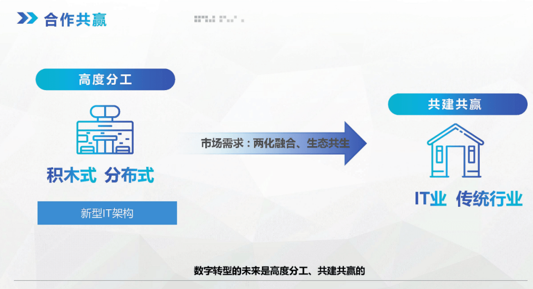 數(shù)字化轉(zhuǎn)型的未來是高度分工、共建共贏的,在新型IT架構(gòu)體系下,未來的系統(tǒng)可以是積木式、分布式的,高性能、高響應(yīng)、低成本、低門檻將是科學(xué)技術(shù)發(fā)展的方向。