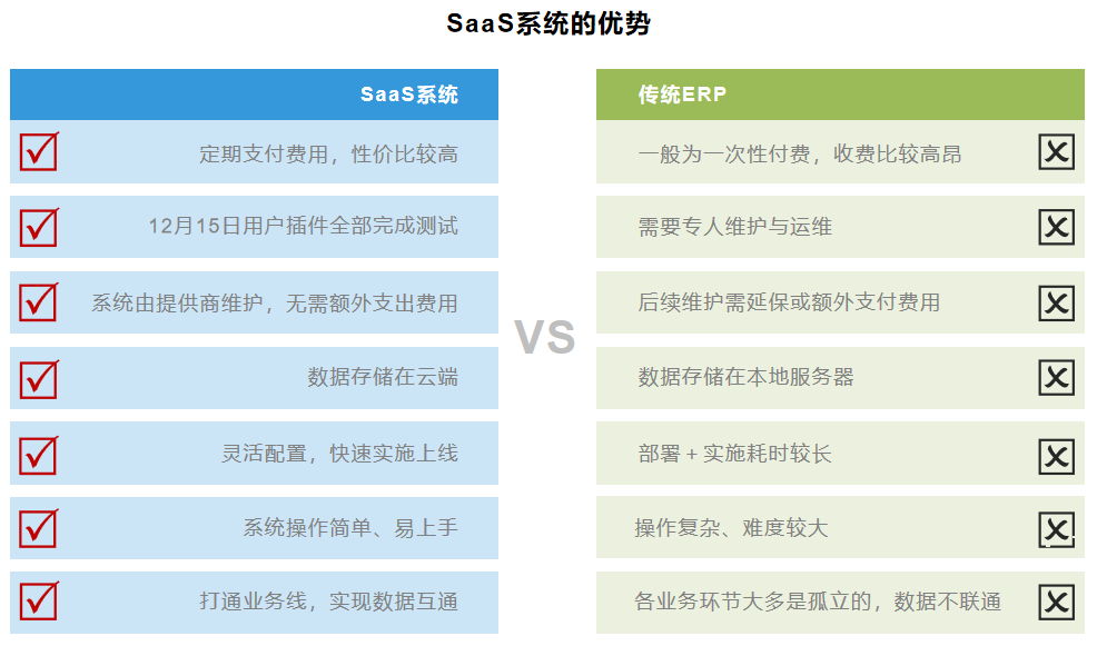 SaaS是云計算應用的一種形式,而傳統ERP系統并不具備此特征;SaaS系統的數據存儲也在云端,而傳統ERP只能存儲在本地服務器中,如果本地服務器故障崩潰,結果可想而知。