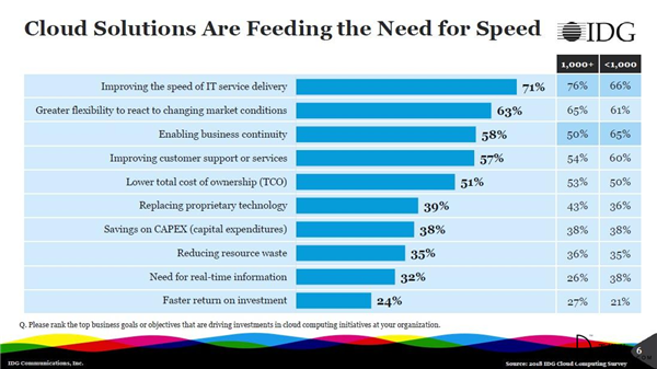 76%的大型企業正在尋求云應用和平臺以加速IT服務的交付。多年來,云計算已經被視作是一個降低成本的優先策略,現在它已經成為數字化業務模式的推動者。IT部門要求快速交付云應用及平臺組件的期望與壓力從未如此之高。而云投資的目的是為企業帶來更大的靈活性,以及它們對不斷變化的市場環境做出反應的能力(63%的全體受訪者對此表示同意),從而推進數字化業務模式的實現。