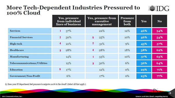 在所有行業中,制造業、高科技和電信/公共事業從業者面臨著最大的高層壓力,他們被要求實現100%的云計算。簡化復雜的制造過程,并提供一個從車間到公司頂層的統一記錄系統的綜合云平臺,是上述三個技術驅動型行業高管管理的重中之重。而實現更好的供應商質量管理、可見性、更好的制造計劃、工作流優化、實現和客戶交付是云平臺能促進制造業增長的數個領域。