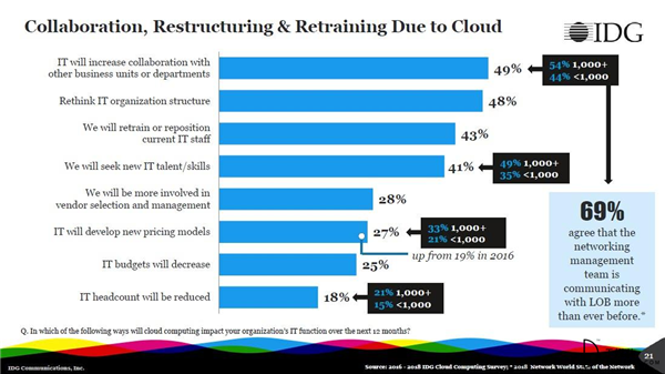 54%的大型企業表示,作為云投資的結果,它們必須增加與其他業務部門的合作。而在所有規模的組織中,48%的受訪者表示云迫使它們重新考慮自身的IT組織結構。其他的變化包括留存和重新定位當前的IT員工,雇傭更多的云技能人才,以及參與全新的供應商選擇和管理體系中。