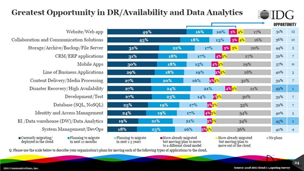 在所有的云應用領域與遷移中中,數據分析和災難恢復具有最大的機會。49%的組織計劃在未來一年到三年中將災難恢復/高可用性系統遷移到云端。而45%的組織計劃在未來一年到三年中將BI、數據倉庫和數據分析應用遷移到云。目前,云計算正被視為一種增長催化劑,它所支持的應用程序正在消除企業收入增長的障礙,并幫助它們在穩定運營的同時獲得新客戶。