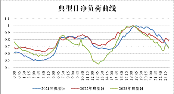 由于湖南光伏發(fā)電裝機(jī)的快速增長,湖南電網(wǎng)凈負(fù)荷曲線(電網(wǎng)凈負(fù)荷=電網(wǎng)負(fù)荷-新能源出力-外受電)產(chǎn)生向“鴨子型曲線”轉(zhuǎn)變的趨勢(shì)(見圖),午間腰荷時(shí)段凈負(fù)荷越來越低,該時(shí)段可再生能源消納困難情況開始顯現(xiàn)。以2023年某日為例,該日光伏發(fā)電出力較大,腰荷時(shí)段電網(wǎng)凈負(fù)荷較前兩年同期明顯下降,同時(shí)低于當(dāng)日低谷時(shí)段凈負(fù)荷,導(dǎo)致腰荷時(shí)段新能源消納更為困難。