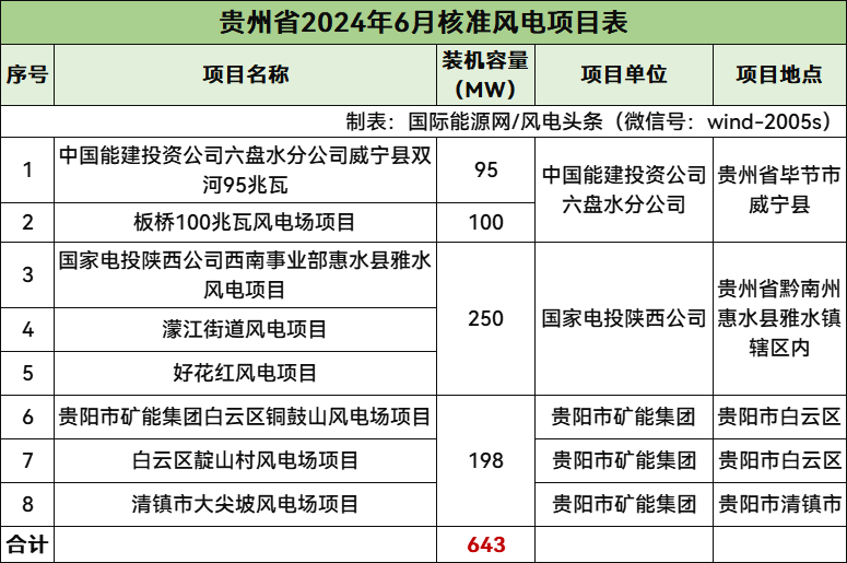 貴州核準8個風電項目,總規模643MW,均為陸上風電項目。