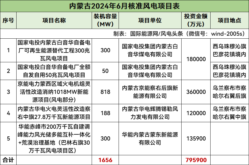 內蒙核準5個風電項目,總規模1656MW,總投資795900萬元,均為陸上風電項目。
