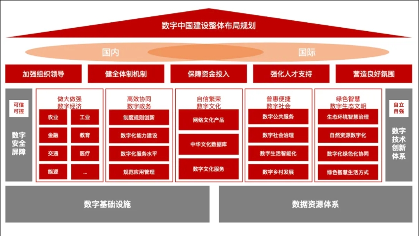 目標到2025 年,基本形成橫向打通、縱向貫通、協(xié)調(diào)有力的一體化推進格局,數(shù)字中國建設(shè)取得重要進展。到2035年,數(shù)字化發(fā)展水平進入世界前列,數(shù)字中國建設(shè)取得重大成就。