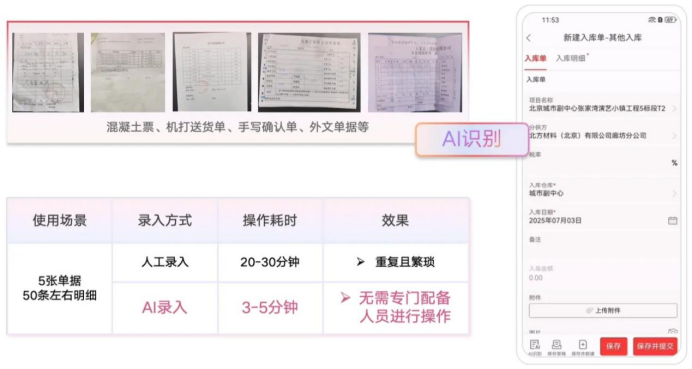 數據的源頭是業務單據,錄入的繁瑣與錯誤是成本失控的隱患之一。紅圈AI系列智能產品中的AI錄單助手作為企業的“智能掃描儀”,能通過大模型自動識別混凝土票、送貨單、手寫確認單乃至合同等各類單據,實現從圖像識別到高質量系統錄入的秒級閉環,可減少90%人工操作。它不僅能提取關鍵字段,更能智能匹配合同明細、關聯歷史數據,讓成本歸集更智能、溯源更方便,從而迭代了整個成本管控流程。