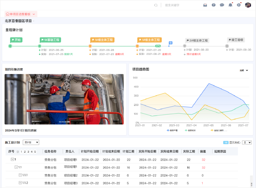實現覆蓋項目全流程的可視化智能管理,完成數據串聯和互聯互通,進一步完善企業管理流程,通過可視化數據記錄并匯總每個項目的立項跟進、產值進度、實際成本、施工日志、收付款、質量安全監控等情況,管理層一鍵掌握全局進展。